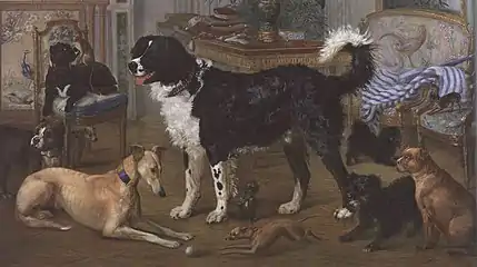 - В интерьере рабочего кабинета великого князя Константина Николаевича, брата императора Александра II, в Павловском дворце придворный художник «собрал» по высочайшему заказу коллективный портрет реальных императорских собак разных пород. Здесь левретка и бульдог, чихуахуа и уэльский терьер, керн-терьер и уиппет. А в центре – ньюфаундленд, принадлежащий Александру II. Собрание Эрмитажа.