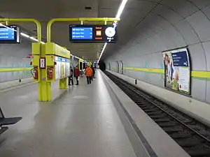Однопролётная станция мелкого заложения, планировались архитекторами Гроскопф (нем. Großkopf) и Шнецер (нем. Schnetzer). Потолок и путевые стены облицованы панелями серебристого цвета комбинируемого с жёлто-зелёными и жёлто-синими фигурами на стенах. Имеет два выхода по обоим концам платформы[2]. Примерно на высоте человеческого роста по всей путевой стене проходит жёлтая полоса. В восточном торце платформы расположен лифт.