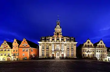 - Городская ратуша в стиле барокко расположена на Старой Рыночной площади прямо напротив церкви Св. Михаила. Построена на месте церкви Св. Иакова в 1735 году после разрушительного пожара 1728 года. После бомбардировки 1945 года здание было реконструировано.