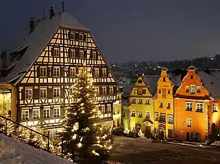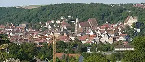 - Церковь Св. Михаила — главный храм города — представляет собой зальную церковь, характерную для зондерготики в Швабии и Франконии. Неф построен в 1427-56 гг., хоры — в 1495—1525 гг., башня — в 1573 году. Внутри интересны: каменная фигура архангела Михаила, попирающего дьявола (ок. 1525); несколько старинных полиптихов (из которых главный датирован 1460 годом); фрески XV века на столбах (напоминают гобелены); ценные витражи XV—XVI вв.; подземный оссуарий. Это один из протестантских храмов Швабии, наименее пострадавших во время Реформации.