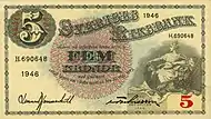 - 1000 крон (с 1 октября 2015 года) с изображением Генерального секретаря ООН, члена Шведской академии Дага Хаммаршёльда. На обратной стороне изображена Лаппландия, чья природа весьма интересовала Дага Хаммаршёльда[3].
