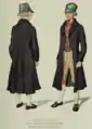 Воротник мужской рубахи был отложной, а шляпы имели высокую тулью. Юбки собирались на поясе и крепилась с корсажем только сзади.