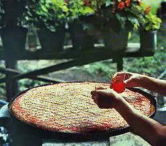 Другой характеристикой является использование ришты, получаемой путем заливки жидкого теста на холодную сковородку через специальную воронку с 11 отверстиями и выпекания её через минуту.