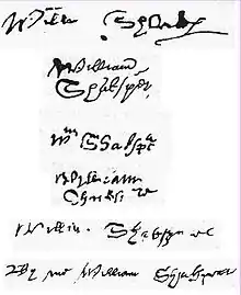 Сохранившиеся подписи Шекспира и титульные листы изданий его работ по-разному воспроизводят его фамилию. Его фамилия фигурирует в различных вариациях как на литературных, так и на официальных документах, особенно различаются рукописные варианты[26]. Этот факт часто используется в качестве доказательства того, что Шекспир не тот человек, который создал приписываемые ему произведения, и его имя было использовано как псевдоним истинным автором[27].