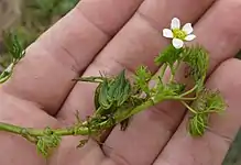 Многолетнее, реже однолетнее водное травянистое растение. Стебли тонкие, 10—80 см длиной, обыкновенно голые или слабо опушённые. Листья в очертании почти полукруглые, до 1,5 см длиной и до 3,5 см шириной, тройчатые, сегменты их также тройчатые или четверные, сегменты наибольшего порядка нитевидные, жестковатые. Черешки до 1,5 см длиной, влагалище с внешней стороны щетинисто-опушённое.