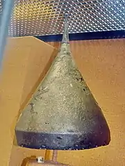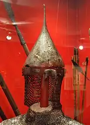 Шело́м (шлем) или каска, использовался в Средние века на Руси и в азиатских государствах, и странах. Отличительной чертой является высокая сфероконическая форма с обратным изгибом конической части. По мнению некоторых оружиеведов, термин «шелом», помимо обозначения конкретного вида защитного наголовья, также был и общим термином, обозначавшим шлем[4][5][6]. Однако применительно к периоду со второй половины XV века и до конца XVII века шелом обозначал конкретный вид русского шлема. На данный момент известно почти полсотни русских шеломов XVI века[7].