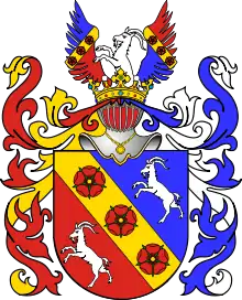 Щит: скошен справа золотой перевязью, обремененной тремя красными розами; в верхнем — голубом, и нижнем — красном полях скачущий белый козел с золотыми рогами и копытами (герб Szembek); щит увенчан графской короной, над которой шлем с графской же короной.