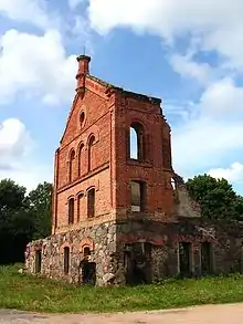 - Винокуренный завод. Завод строился Болеславом Скирмунтом в начале XX в. От здания сохранились руины бокового кирпичного фасада и цокольного этажа из бутового камня. Среди других зданий подобного рода выделяется своей декоративной отделкой: полукруглые окна, поребрик, башенки.