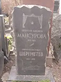 - Halida Rojkova. Шереметьев и Мансурова? Красивая история любви графа и актрисы (англ.). www.topauthor.ru. Дата обращения: 12 июня 2019. Архивировано 29 сентября 2018 года.