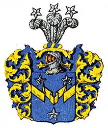 На щите дворянский коронованный шлем. Нашлемник: три страусовых пера, на каждом из которых серебряная пятиугольная звезда. Намёт на щите золотой, подложенный лазоревым.