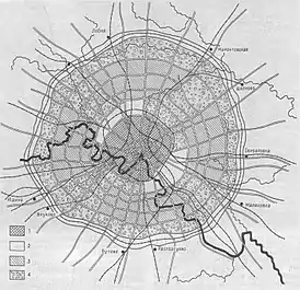 Автор концепции «Большая Москва» (1925 — начало 1930-х г.г.), предусматривающей развитие радиально-кольцевой структуры Москвы в рамках второй Окружной железной дороги в 28 — 30 километрах от центра Москвы и двух колец городов-спутников в Московской, Владимирской и Калужской губерниях. Согласно концепции численность населения Москвы была определена к 1945 году в 4 млн человек, к 1960 году — 6 млн человек; в новых границах Московская губерния должна была занимать площадь 4000 квадратных километрах при диаметре 240 километров.