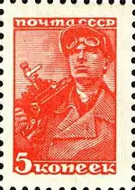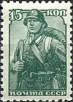 - Красноармеец, тёмно-зелёная. Печать типографская на простой бумаге без водяного знака, перфорирована: комбинированная гребенчатая зубцовка 12:12½ (на каждые 2 сантиметра края марки приходится 12:12½ зубцов). В марочных листах по 100 (10×10) марок[4][5][8].