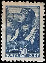 - Лётчик[Комм 1], синяя. Литография на простой бумаге без водяного знака, перфорирована: комбинированная гребенчатая зубцовка 12:12½ (на каждые 2 сантиметра края марки приходится 12:12½ зубцов). Отличается от марки (ЦФА [АО «Марка»] № 695), отпечатанной типографским способом, отсутствием вдавленности рисунка, белым пятном на лице за глазницей, штриховкой воротника и другими деталями. В марочных листах по 100 (10×10) марок[4][5][12].