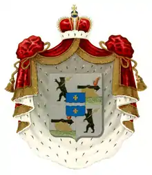 «В 1-й и 4-й частях щита медведь с секирой на плече. Во 2-й и 3-ей частях — пушка с сидящей на затворе райской птицей. В малом щитке волнообразный пояс, над ним и под ним по равноконечному кресту. Нашлемник — справа налево — три короны, в каждой короне пушка с птицей на затворе, медведь с секирой, между двух страусовых перьев горизонтально волнообразный пояс с крестом. Щит покрыт мантией и шапкой, принадлежащих княжескому достоинству»[6].