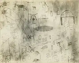 ![]() Рисунки, выцарапанные на стене пациентом с диагнозом «деменция прекокс». Из архивов госпиталя святой Елизаветы. Начало XX века, Вашингтон | |