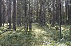 Преобладают хвойные леса: сосняки, ельники. 3,2 % площади занимают мелколиственные леса (березняки, сероольшаники). Среди кустарников выделяется рябина, среди травяно-кустарничковых — брусника, черника, ожика, майник, седмичник, плаун сплюснутый. Встречаются редкие в области растения: зимолюбка зонтичная, лиственница сибирская[4].