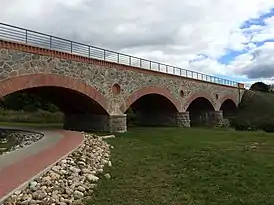 Мост пятипролётный железобетонный балочный. Пролётное строение состоит из железобетонных балок, опирающихся на каменные опоры[4]. С фасадов балки закрыты 5 полуциркульными сводами. Длина пролётов составляет 13,55 м. Фасады моста сложены из бутового камня, нижняя часть арок — из кирпича, поверхности опор облицованы камнем грубой тески. Над промежуточными опорами устроены круглые проемы. Перильное ограждение металлическое простого рисунка, завершается на устоях кирпичными парапетами. Длина моста составляет 82,5 м, ширина — 8,7 м[1].