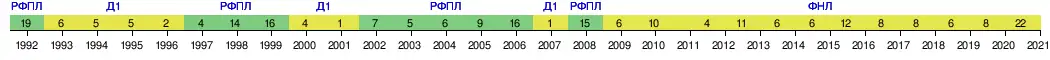 | 2011/12 | ФНЛ | 52 | 25 | 10 | 17 | 70-56 | 85 | 1/16 | Стыковые матчи за выход в премьер-лигу | ||