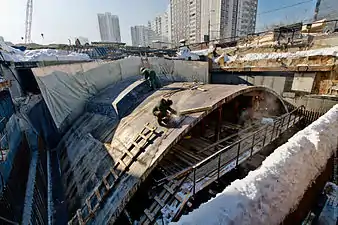 Односводчатый станционный зал с прямой островной платформой выстроен из монолитного железобетона. Генеральный подрядчик строительства — ОАО «Трансинжстрой»; монолитные работы выполнены СМУ-3 «Мосметростроя». Путевые стены и лотки станции бетонировались в крупнощитовой опалубке из алюминиевых балок МЕГАФОРМ АЛ.
