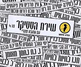 Текст песни Шират ха-стикер состоит из пятидесяти двух стикеров, которые в Израиле клеят на автомобили, выражая этим свою позицию. Стикеры могут говорить о религиозных или политических взглядах человека[1].
