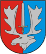 На гербе изображена голова лося, символизирующая окрестные леса, и меч, символизирующий битвы с врагами[5]. Дата принятия: 30.10.1997.