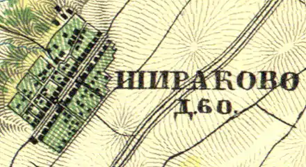 Согласно карте профессора С. С. Куторги 1852 года, деревня называлась Шираково[8].