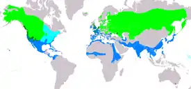 Область распространения охватывает оба полушария. В Южной Европе гнездится спорадично в Южной Испании и Франции, включая Корсику. Северо-восточнее широко распространена на Британских островах (в том числе, на Оркнейских островах и Гебридских), широкой полосой вдоль северного побережья Атлантики, в Южной Норвегии, Швеции, Финляндии южнее 63° с. ш. Также гнездится в Исландии. В Центральной Европе гнездовой ареал охватывает Австрию, Сербию, Чехию, Словакию, Венгрию, Македонию, Румынию и Болгарию. Обычна на большей части Германии, Польши, стран Прибалтики, Белоруссии и Украины. Южная граница ареала проходит через черноморское побережье Турции и Закавказье[6].