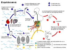 Когда фекалии или моча, зараженные яйцами шистосом попадают в пресную воду, из яиц вылупляются мирацидии, они быстро плывут с помощью ресничек, которые покрывают поверхность их тела. Далее мирацидии проникают внутрь тела улитки, их промежуточного хозяина. Виды улиток, которые служат промежуточным хозяином, могут отличаться для каждого вида шистосом[1].