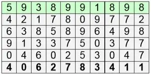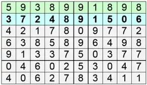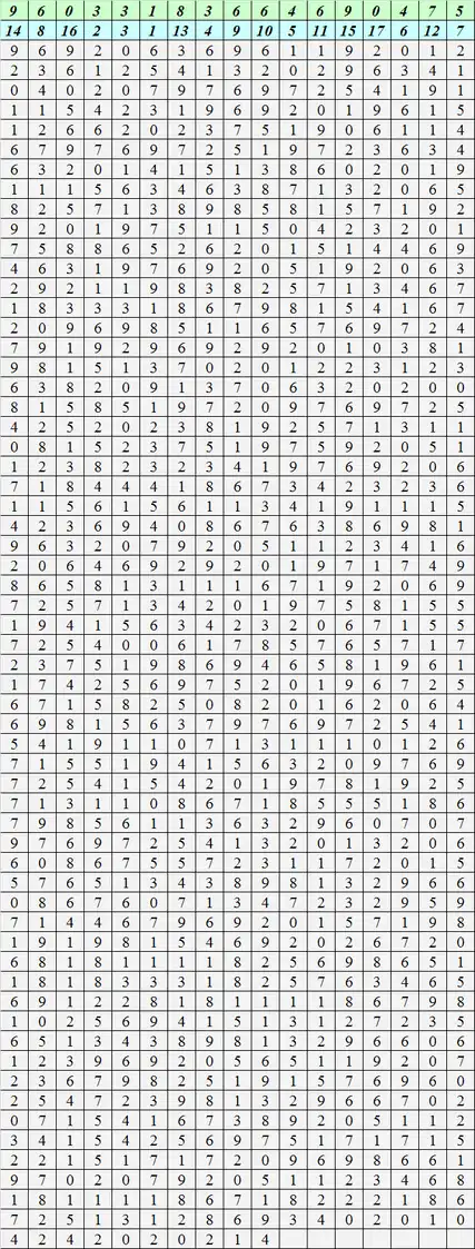 Цифры выбирались сверху вниз по вертикалям; выбираемые столбцы следовали согласно нумерации, данной во второй строке. В результате получали последовательность из 31 псевдослучайной цифры: