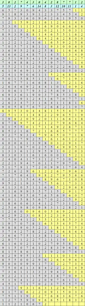 Результат первой перестановки - Вторая перестановка являлась неравномерной. Для её осуществления составлялась вторая таблица, в данном случае состоящая из 14 строк. В первых двух строках располагались последние 14 кодовых цифр и их номера. Число оставшихся строк подбиралось достаточным для вмещения всех цифр текста. Для размещения 1030 цифр необходимо 74 строки. Затем в основной части таблицы окрашивались треугольные области: k-ая область опиралась верхним левым углом на строку с номером (согласно нумерации во второй строке) k, нижний правый угол упирался в край таблицы:В таблицу по строкам записывался полученный в п.11 текст, причём вначале целиком заполнялась серая область таблицы, затем жёлтая — до использования всех цифр. По подобию пункта 11, текст основной таблицы выписывался по столбцам, согласно нумерации во второй строке, в таблицу:Вторая таблица перестановки