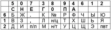Рисовалась таблица с 4 строками и 10 столбцами, в первой строке записывались первые 7 букв кодового слова, в остальных строках записывались в вертикальном порядке остальные буквы русского алфавита, точка, запятая, а также некоторые условные обозначения: «п/л» — переход на латинскую азбуку, «н/ц» — начало цифрового текста, «н/т» — начало шифруемого текста, «пвт» — повторение предыдущего текста. Номерами столбцов служили полученные 10 цифр, первый столбец оставался без номера, остальные 3 получали номера, соответствующие последним 3 цифрам числа. Соответствие устанавливалось следующим образом: каждая буква заменялась на число, состоящее из номера строки и номера столбца. Символы первой строки, не имеющей номера, заменялись номером столбца.
