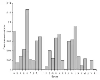 Другой подход к применению метода грубой силы для взлома — проверить частотности букв. Изобразив диаграммой частотности букв в зашифрованном тексте, и зная ожидаемое распределение букв для обычного текста на рассматриваемом языке, можно легко определить сдвиг, взглянув на смещение некоторых характерных черт на диаграмме. Этот метод известен как частотный анализ. Например, в тексте на английском языке частотность букв E, T, (обычно наиболее частых), и Q, Z (обычно более редких) особенно различаются[17]. Этот процесс можно автоматизировать, сделав, чтобы компьютерная программа оценивала, насколько хорошо фактическое распределение частотностей соответствует ожидаемому распределению. Например, может использоваться критерий хи-квадрат[18].