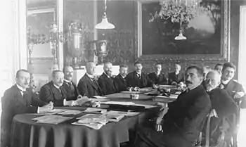 Первое заседание кабинета Шейдемана 13 февраля 1919 года в Веймаре. Слева направо: Ульрих Раушер, Роберт Шмидт, Ойген Шиффер, Филипп Шейдеман, Отто Ландсберг, Рудольф Виссель, Густав Бауэр, Ульрих фон Брокдорф-Ранцау, Эдуард Давид, Гуго Прейсс (стоит), Йоханнес Гисбертс, Йоханнес Белль, Георг Готгейн, Густав Носке