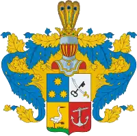 Щит разделён на четыре части, в первой части, в голубом поле, изображены три золотые восьмиугольные звезды. Во второй части, в серебряном поле, крестообразно положены ключ и меч. В третьей части, в золотом поле, журавль, держащий в левой лапе камень. В четвёртой части, в красном поле, серебряный якорь, обвитый канатом.