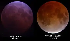 Два полных лунных затмения, имеющие яркость примерно в 2 (слева) и 4 (справа) балла по шкале Данжона