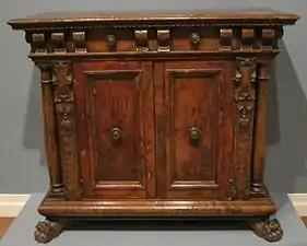 В эту пору кабинет-шкаф превратился в весьма затейливое сооружение. Он нередко снабжался откидной или выдвижной доской для письма. Фасады напоминали красивые здания, они украшались колонками, карнизами и даже балкончиками. На дверцах и ящиках выполняли настоящие картины из различных материалов. Кабинеты, сделанные мебельщиками разных стран, имели свои особенности. Например, испанские мастера украшали наружные стенки прорезными металлическими накладками, под которые наклеивали цветной бархат, а дверцы и ящики инкрустировали слоновой костью. Флорентийские мебельщики любили делать кабинеты из чёрного дерева и украшали их самоцветами. На ящиках изображались объёмные цветы, птицы и фрукты. В немецком Аугсбурге, славившемся резчиками по дереву, обязательным атрибутом была богатая резьба.