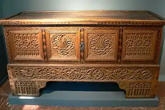 В парижском Музее декоративного искусства представлен грубоватый, похожий на сторожевую будку, экспонат. Конечно, он уступает своим современникам-ларям-сундукам по красоте и богатству отделки, но зато гораздо удобнее их. Табличка гласит, что это — редчайший дошедший до нас образец шкафа XIII века[10].