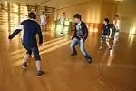 Футбольный матч в большом спортивном зале