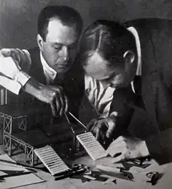 Сцена из спектакля «Мой друг» Н. Погодина. Гай — М. Ф. Астангов (справа). Руководящее лицо — М. М. Штраух. Постановка А. Попова. Художник И. Шлепянов. Театр Революции, 1932 г. - 1950 — «Семья Тараса» Д. Кабалевского