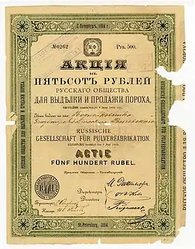 - По некоторым сведениям, вскоре после начала Первой Мировой войны заводы перешли в ведение Военно-Морского ведомства. Однако сведения не получили подтверждения: в фондах РГА ВМФ хранятся лишь дела, связанные с поставками пороха (Артиллерийская часть), произведенного на заводах Общества.