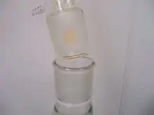 - Недостаток смазки в шлифовом соединении или неподходящая смазка. Некоторые соединения могут растворять смазку, что приводит к контакту между двумя оголенными частями шлифа. При нагревании смазка может чрезмерно разжижиться и вытечь из шлифа, что особенно легко происходит при работе при нагревании под вакуумом, когда атмосферное давление вжимает керн в муфту[8].