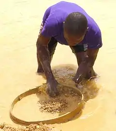 Россыпное слабоокатанное золото в тяжёлом (чёрном) шлихе в шлиховом лотке. Чёрная масса — песчаная фракция тяжёлых минералов — в первую очередь — магнетита. Август, 2009, Горный Алтай. | ![]() |