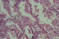 - Третья стадия. При третьей стадии без специальной поддержки организм нежизнеспособен. Развивается цианоз. Рентгенологически выявляется увеличение количества и размеров очаговых теней с переходом их в сливные образования и тотальное затемнение лёгких. Парциальное давление кислорода снижается до критических цифр.
