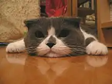 ![]() Взрослый шотландский вислоухий кот, демонстрирующий круглую форму головы, круглые глаза и загнутые вперёд уши | |
