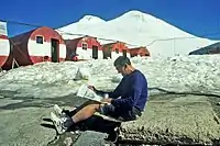 Д. Шпаро читает газету «Вечерний Донецк» на Эльбрусе
