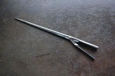 Шпиговальная игла, называющаяся также «лардуар» (фр. lardoir)[13] и «шпигальце», бывает двух видов: полая и с канавкой. Полые иглы имеют диаметр около 5 мм и крючок, на который крепится шпик. Четыре шпиговальные иглы находятся на гербе французского гастрономического общества Confrérie de la Chaîne des Rôtisseurs[14]. Шпиговать можно и без иглы, проделав в куске мяса карман для шпига ножом[7].