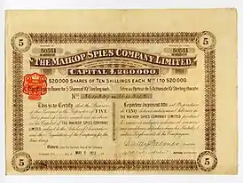 ![]() 5 акций в 10 шиллингов каждая на предъявителя нефтепромышленной компании «Майкопское общество Шпис с ограниченной ответственностью» с основным капиталом в 260 тыс. ф. ст. Лондон, 1913 год. | |