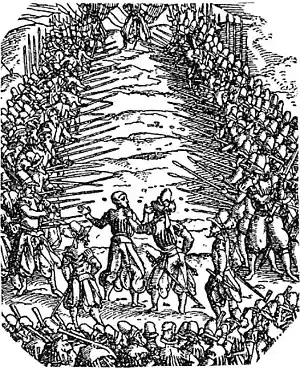В английских вооружённых силах англ. gantlet, gauntlet — название старинного наказания, когда провинившегося гонят ударами палок сквозь двойной строй солдат или матросов. В русских войсках имперского периода жаргонное название — «прогнать сквозь строй».