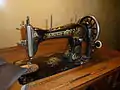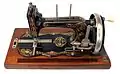 Приспособление механической швейной машинки для наматывания нити на шпульку (справа), привод от наружной окружности маховика при прижатии к нему