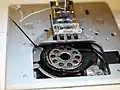 Приспособление механической швейной машинки для наматывания нити на шпульку продольного челнока (справа), привод от шестерёнки маховика